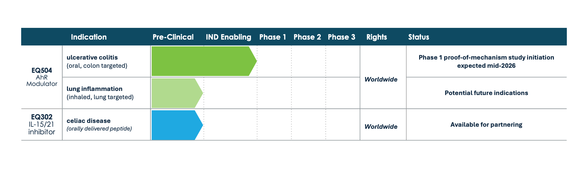 EQ504: an investigational potent and selective aryl hydrocarbon receptor (AhR) modulator designed with a multi-modal, non-immunosuppressive mechanism of action to be complementary to other inflammation and immunology agents. AhR is critical to barrier organ tissue physiology and immunology, maintaining barrier function and promoting tissue repair and regeneration, while regulating resident immune cells with anti-inflammatory responses. EQ504’s preclinical properties provide the potential for targeted, local delivery via enteric coating for the treatment of ulcerative colitis and pouchitis or inhaled formulations for the treatment of inflammatory lung diseases.
